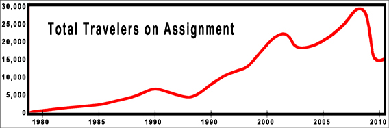 June 14, 2011 update: As has been all too apparent since late 2008, the total number of travel nurses varies from month to month. This original article (below this update) from 2007 is wildly inaccurate as a measure of total travel nurses today, 6 months ago, or a year ago. Basic research done for the History of Travel Nursing article (also published today) has enabled us to create a continuous graph representing total nurse travelers from the beginning of the industry in 1978 to the present day. We plan on updating this graph every two years or so with up-to-date numbers.